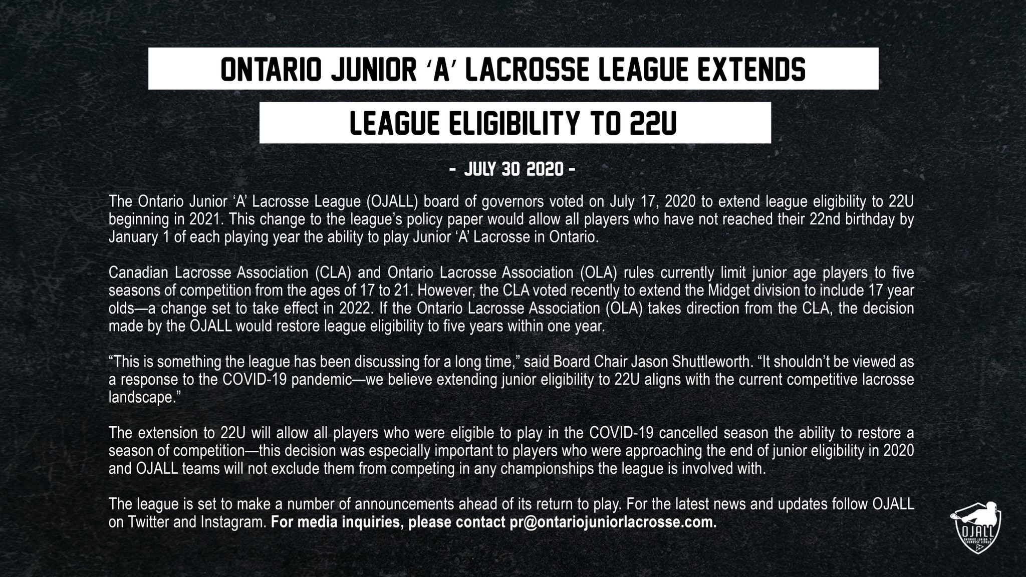 Ontario Junior Lacrosse League On Twitter 𝗜𝗻 𝗰𝗮𝘀𝗲 𝘆𝗼𝘂 𝗺𝗶𝘀𝘀𝗲𝗱 𝗶𝘁 The Ojall Announced Yesterday That The League Has Extended Player Eligibility To 22u The Decision To Change To The League S Policy